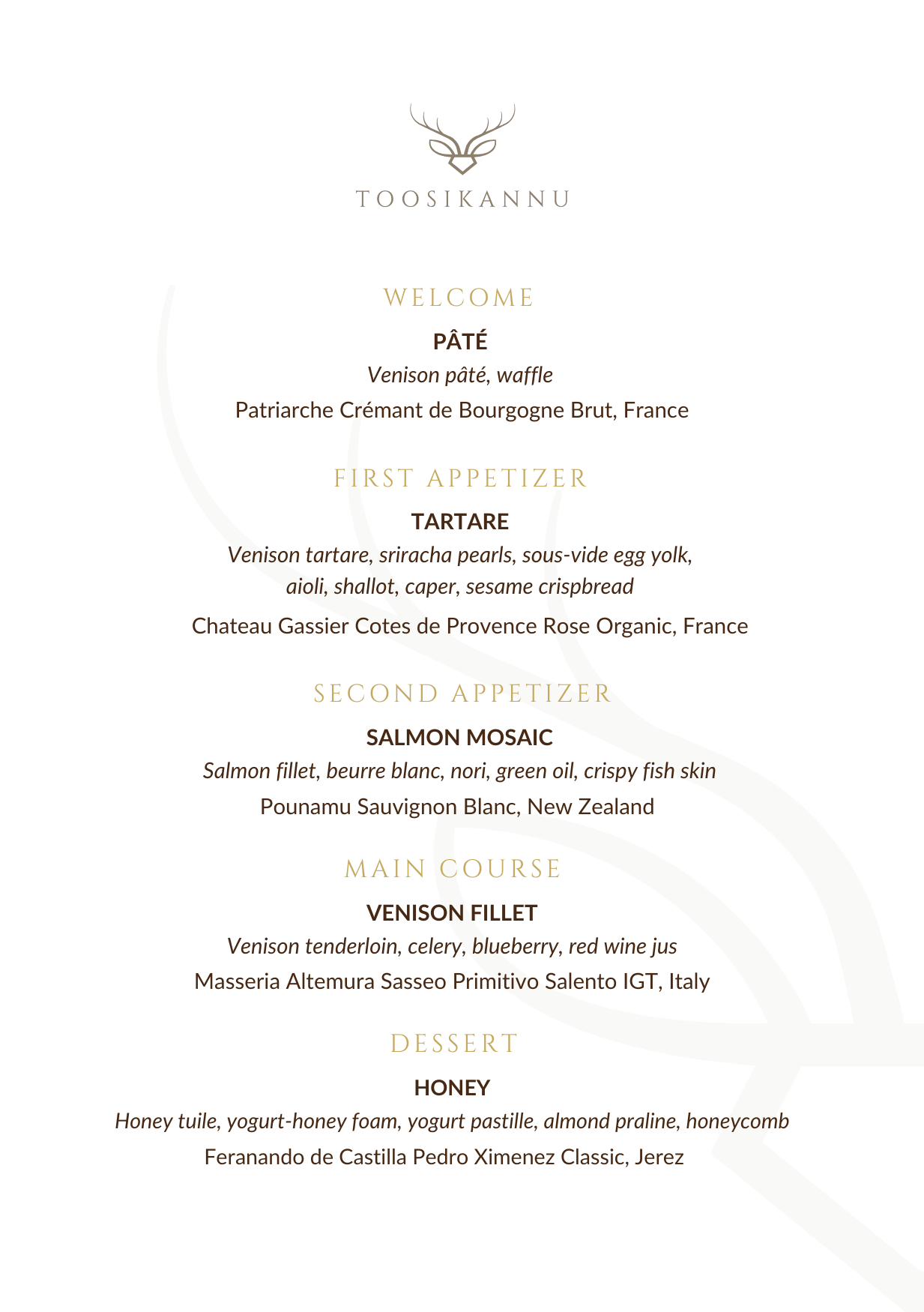 • Menüü: viiekäiguline õhtusöök, loodud peakokk Taavi Tali poolt, inspireerituna hooaja maitsetest ja loodusest. Õhtusöögiga sobitatud veinipakett. Tutvu menüüga siin.