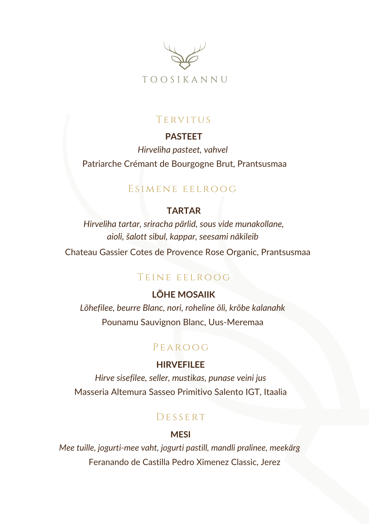 Toosikannu peakokk Taavi Tali on loonud menüü, mis hingab kaasa kohaliku looduse rütmile ja hooajalisusele tõstes esile puhtad maitsed ja peened detailid. Tuttav ja uus põimuvad taldrikul loomulikul moel, tuues lauale midagi värsket, inspireerivat ja ehedat.